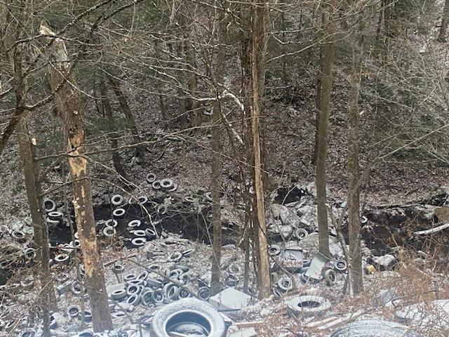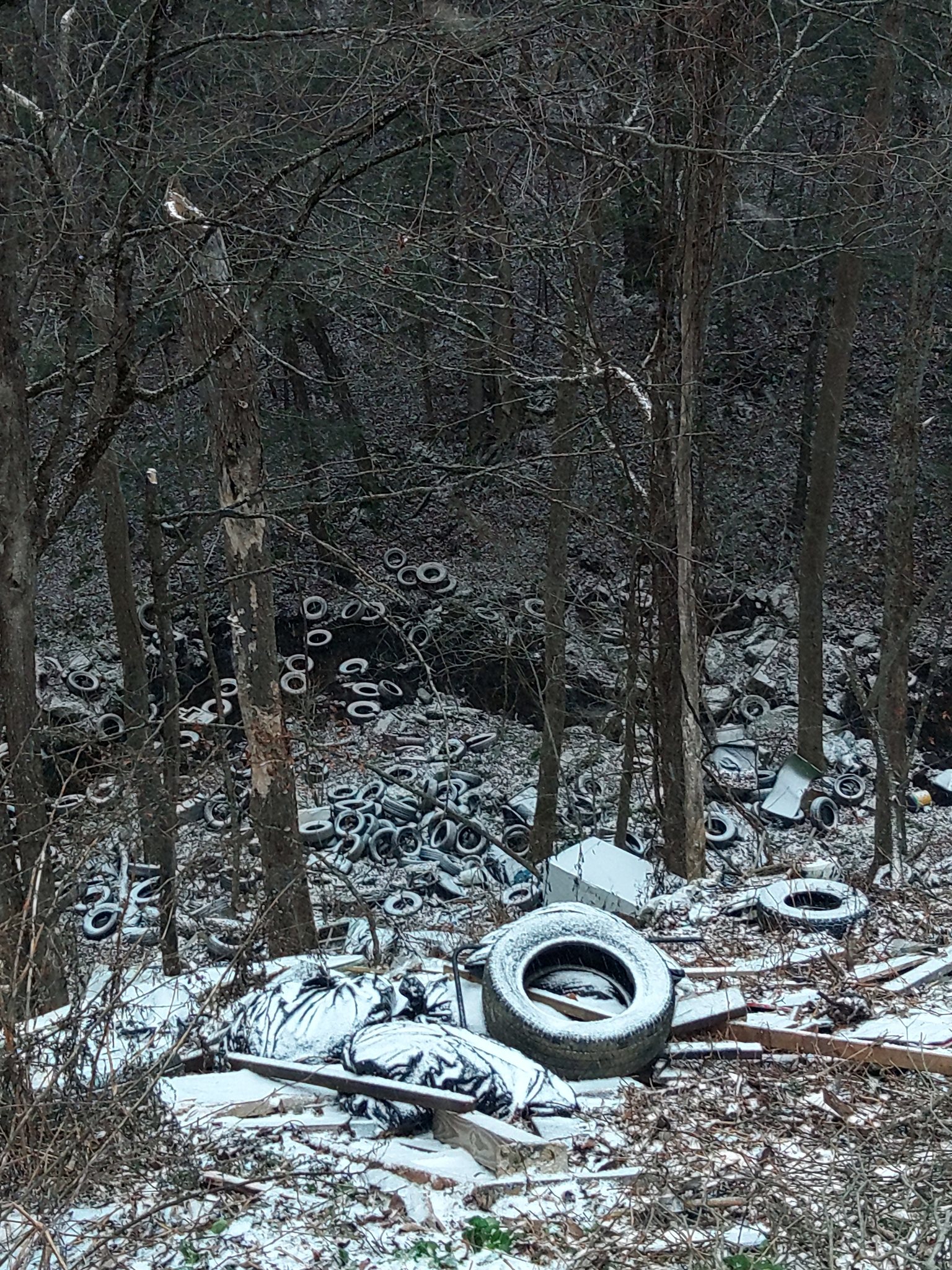 As the pictures show (Photos by James Burke) , the land adjacent to the jut-ourt has been regularly- and long-used as a private dump by ignorant cretins who think the rules of good stewardship and citizenship do not apply.