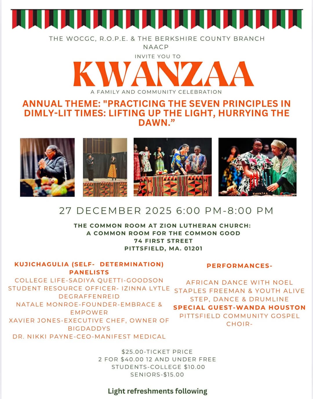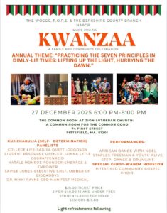 Beginning at 6 p.m. Saturday (12/27) at Zion Lutheran Church (74 First St., Pittsfield), Kwanzaa will be celebrated. Sponsors include the local chapter of the NCAA, the Women of Color Giving Circle (WOCGC), and the R.O.P.E. (Rites of Passage and Empowerment) group (for “young women of color and young people identifying as female or non-binary).