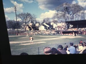 Wahconah Park, in better days. Early in the 1968 season, Red Sox pitcher Paul Dowd throws to an Indian batter. First baseman Jim Russin awaits. (Photo by Dan Valenti).